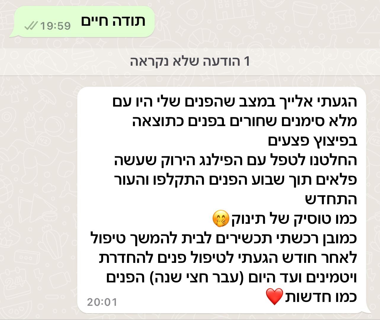 כבר לאחר 2 טיפולים חוויתי שינוי ופיזור בפיגמנט והבהרה – לאחר שימוש בתכשירי השיקום